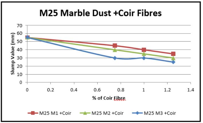 (Graph 1,2,3) VariationinslumvalueforCoirFibres (M25)VariationinslumvalueforMarbleDust+Coir Fibres(M25)