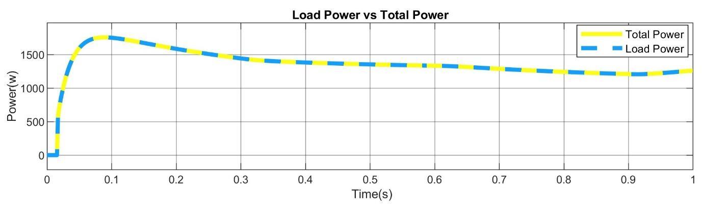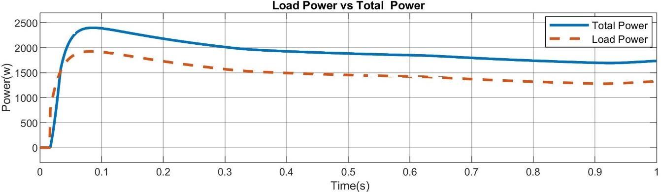 Figure (7) shows us the graph of load power vs total power of the passive HESS system. The load power is almost the sameasthatofthetotalpowerbecausethereisadirectconnectionbetweenthebatteryandsupercapacitortotheloadas therearenoactivepowerelectronics(DC-DCconverter)inthecircuit,whichmeanstherearenoadditionalpowerlosses. Contrarytothis,inFA-HESS,thegraph (Figure 8) ofloadpowervstotalpowershowsthatthetotalpowerofthesystemis more than that of the load. One of the reasons for that is the DC-DC converters which control the power flow from the batteryandSCandsupplythattotheload.Wecomparedthegraphs,andwediscoveredthatthepassiveHESSgenerateda peakpowerof approximately 1700 watts,whiletheFA-HESSgenerateda peakpowerof approximately 2400 watts.This meansthateventhough therearesomepowerlossesassociatedwiththeFA-HESS,thepowerdissipatedbytheFA-HESS tothesystemisaround41%morethanthatofthepassiveHESS.