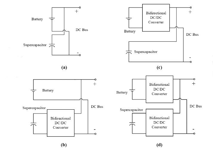 Full-active HESS (FA-HESS) (Fig (3d)) solves the disadvantages of both semi-active HESSs. Both the battery and the supercapacitor are controlled by DC-DC converters, which are connected to the DC link, which is connected to the load. Thesupercapacitoreffectivelyutilizesitswholeoperatingvoltagerange,eliminatingtheneedforhigh-powerpulsesfrom the battery.Thisisachieved by efficientlymanaging its currentandcorrectlyadjustingtheDC-link voltagevia theuse of DC/DCconverters.Nevertheless,thesystemissomewhatintricate,anditseffectivenessisexpectedtobesubparduetothe transferofpowerviaDC/DCconverters[19].