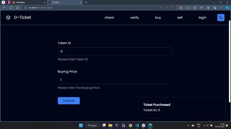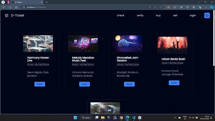 Theproposeddecentralizedticketingsystempresentsa novel approach to online ticketing, integrating blockchain technologyandnon-fungibletokens(NFTs)toovercomethe limitationsofthecentralizedticketingmodel.Thisinnovative systemaimstoprovideasecure,transparent,andequitable ticketingexperienceforbotheventorganizersandattendees.