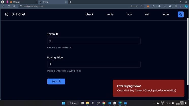 3) IntroductionofaDecentralizedSecondaryMarket:The proposedsystemintroducesadecentralizedsecondary marketfortickettrading,enablinguserstobuyandsell tickets directly on the blockchain platform. By eliminating intermediaries, the secondary market promotes transparency and fairness in ticket pricing. Pricesaredeterminedbymarketdynamics,preventing scalping practices and ensuring equitable access to tickets.