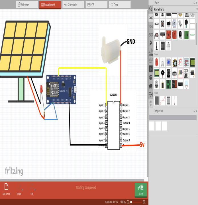 With the ULN2003, Node MCU is selected as high voltage, high-currentDarlingtonarrays.Thesearraysgenerallyhave 7 common emitters and open collector Darlington pairs. Capableofwithstandingpeakcurrentsupto600mA,every channel has a 500 mA rating. To make the board layout simpler,theinputsarepinnedadjacenttotheoutputs,and suppressiondiodesareincorporatedenablinginductiveload control.WhichwilldrivetheDCwaterpumpasNodeMCU cannotdrivethemotor.Setupthewholediagramaccording tothecircuitasshowninFig.6.