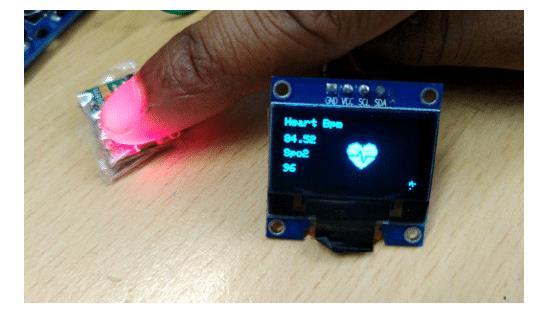• Display Output:Theprocesseddataissenttothe OLED display, where it is shown in a readable format for immediate visual feedback. The OLED displayupdatesin real-time toreflectthecurrent healthparameters.