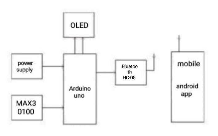 microcontroller, MAX30100 sensor, Bluetooth HC-05 module,OLEDdisplay,andMITAppInventorapplication.