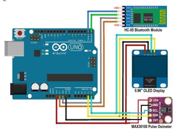 • Data Processing:TheArduinoUnoprocessesthe sensordata,calculatesthebloodoxygensaturation (SpO2) and heart rate, and prepares this informationfordisplayandtransmission.