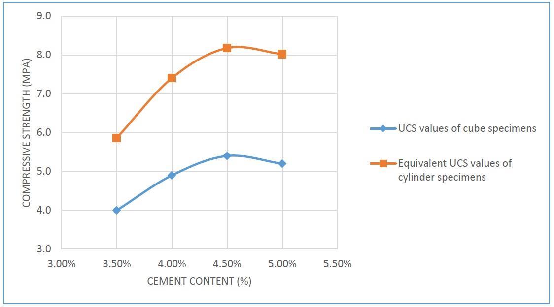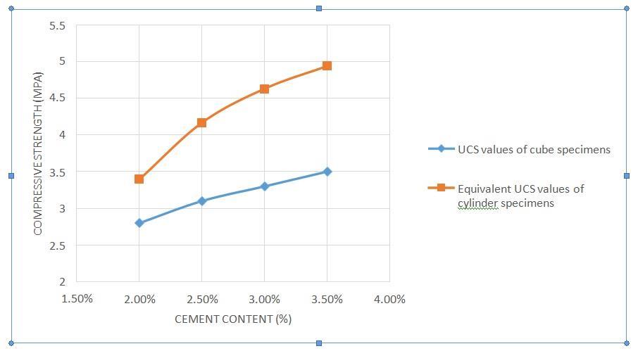 Figure 4.8 (b) Comparison of the UCS values of cube specimens with the equivalent UCSvalues of cylinder specimens for use in the cement treated base [Moorum=50%+ A10=15%+A6=35%]