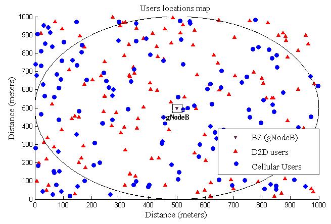 Thebasestationislocatedinthemiddleofthestudiedcell and the primary transmission medium is air, which has uniform free space losses. We adopt the mmW band (28 GHz).ThelocationsofcellularandD2Duserschangeineach iterationandduringacertaintimeperiod.