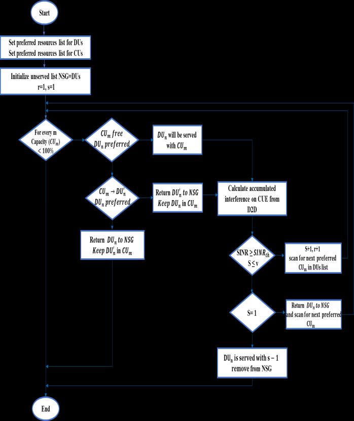 When designing an algorithm for radio resource allocation,weviewitasafunctionthattakesintoaccount several parameters, which are DUs, CUs, and downlink or uplinkchannels.NonServedGroup(NSG)isforunmatched DUs.Thepreferredpairingiswhichcausestheleastpossible mutual interference for users according to the proposed many-to-many matching algorithm for the first scenario showninFig-2