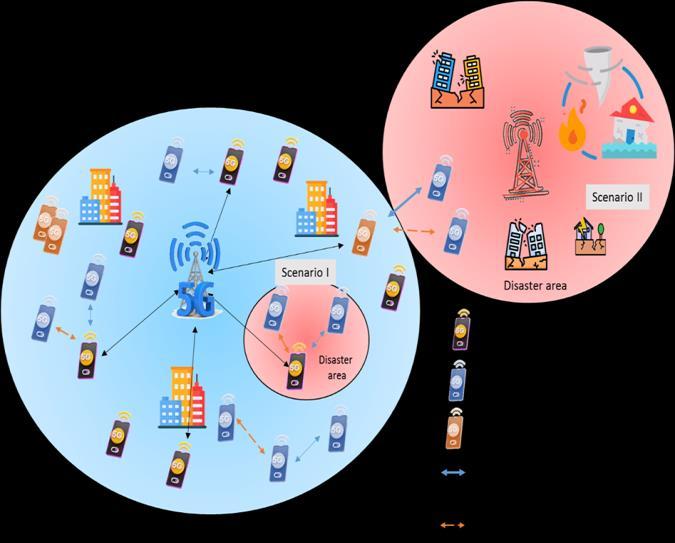 The post-disaster areas can be classified into coverage areas and out-of-coverage areas. Cellular users can communicatewitheachotherunderthecoverageofthebase station, while users outside the coverage area resort to multi-hopD2Dcommunicationstocommunicateorwithin thesamecoverageareabutdependingontheclosedistance betweenusers[3].