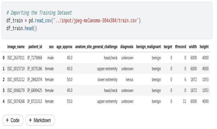 The first step involves importing essential libraries and packages required for data manipulation, preprocessing, andmodel building.KeylibrariesincludeTensorFlowand Kerasfordeeplearning,aswellasPandasandNumPyfor data handling. The dataset, publicly available on Kaggle, contains melanoma records from the USA dated September 2018. Kaggle is an online platform that brings together data scientists, machine learning practitioners, and enthusiasts from around the world. It's a playground for exploring, learning, and competing in the exciting realmofdatascience[17].