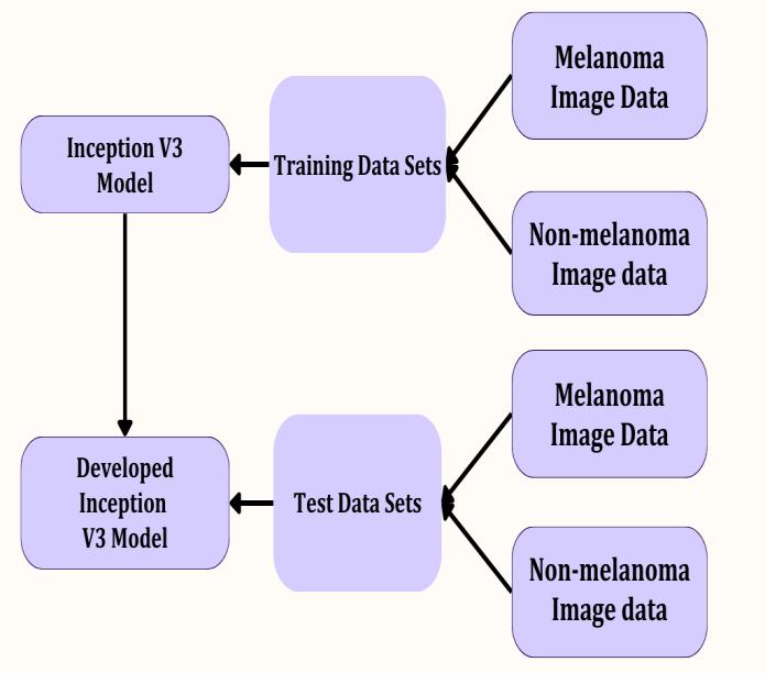 This research work aims to leverage these advancements to improve melanoma skin malignancy classification. The dataset includes two classes: melanoma and nonmelanomaError! Reference source not found..Usingthe publicly accessible ISIC database for training and testing images,theAIarchitectureInception V3wasemployed to train the dataset. Unlike previous studies that compared melanomawithspecificorotherskin-relateddatasets,this approach includes all other skin-related diseases as nonmelanoma for comprehensive comparison and improved accuracy.Thismethodaimstodistinguishmelanomafrom otherskindiseases.