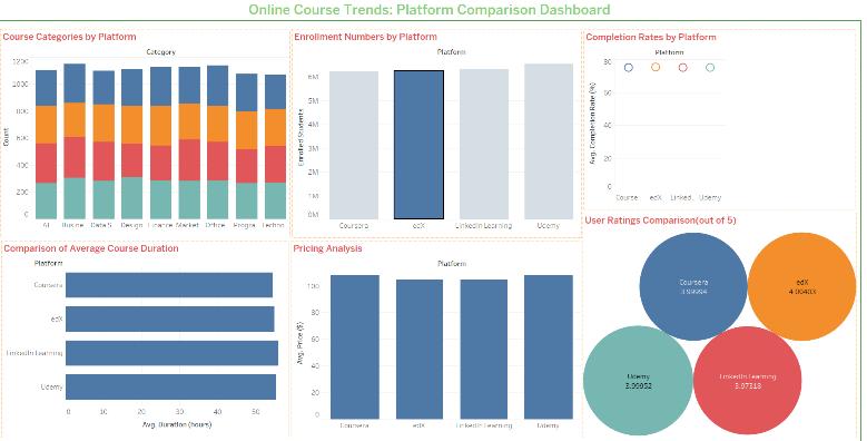 Onlinelearningplatformsofferadiverserangeofcourses covering various subjects and levels of complexity. This diversity,whilebeneficial,poseschallengesforstakeholders whomustnavigateandleveragetheseplatformseffectively. By employing a robust data analysis approach, this study compares several platforms across multiple dimensions, including course categories, duration, enrollment rates, completionrates,platformtypes,pricingstrategies,anduser ratings[3].