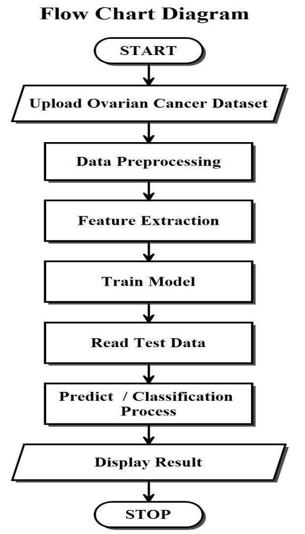 The flow chart diagram outlines the process of predicting and classifying ovarian cancer using machine learning techniques,startingwiththeinitiationoftheworkflow.The first step involves uploading the ovarian cancer dataset, followed by data preprocessing, where the raw data is cleanedandpreparedforanalysis.Next,featureextraction