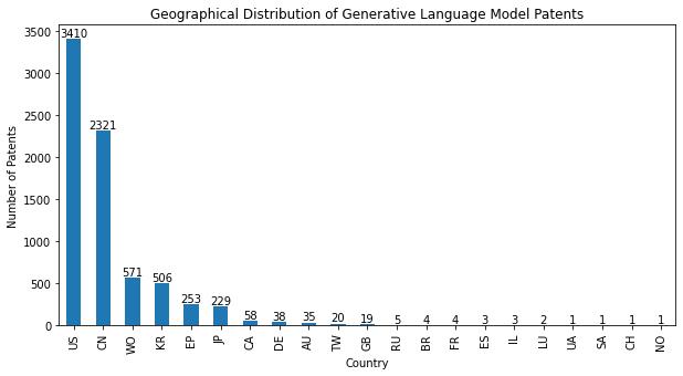 Geographical analysis: This analyzes the geographical distribution of patents. There are 21 countries having patents with respect to generative language model in our dataset. The number of patents based on the country is countedandsortedindescendingorderandabarchartis plotted.Thechartisasgiveninfigure3.