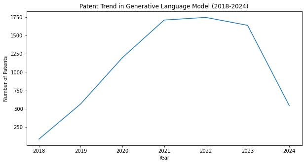Inthisanalysisweselectedthepatentsdatasetsfrom2018 onwards related generative language models from Google Patents. The Trends analysis, Assignee analysis and Geographicalanalysisonthepatentsdataset.Initiallythere wereveryfewpatentsandonyearsthenumberofpatents increased. The assignee analysis provides the number of patents owned by the entity. The geographical analysis showsthereweremanycountrieshavingthepatentsrelated to generative language models. From this analysis we understoodthattheGenerativeLanguageModelsarecurrent trend.Theresearchworkcanbeconductedinthisareaasit hasapplicationsinmanydomainslikeBusiness,Education, Researchandmany.