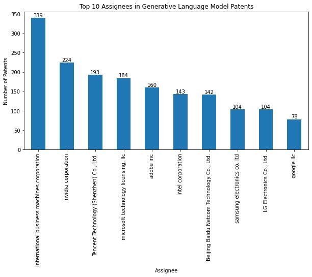 Assignee analysis: Assigneeistheorganizationorperson who have the ownership of the patent. This analysis provides the details about the patent holders related generativelanguagemodel Inourdatasettherearearound 2700assignees.Thenumberofpatentsundereachassignee iscountedandsortedindescendingorderandbarchartis plottedforonlytop10assignees.Thebarchartisgivenin figure2.
