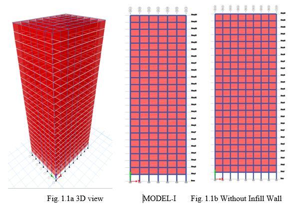Abstract - In countries like India where seismic activity is widespread, reinforced concrete frames with masonry infill walls are a popular technique. In structural analysis, brick walls are usually considered non-structural elements; only their mass fraction is considered and their structural properties such as strength and stiffness are usually ignored. Structures in seismically active areas are very susceptible to severe damage. In addition to bearing capacity, the structure must withstand lateral loads, which can cause significant stresses. Reinforced concrete frames are the most used building materials in the world today. The frames of a framed structure are often filled with rigid materials such as brick or concrete block, usually to form an envelope. In this research paper, we analyze the structure of a G+23-story rectangular 32mx24 base multi-story building with each floor height of 3.2m and various parameters such as slabthickness of150mm, masonry infill support panel height of 390mm and width of 230mm, external column size 600 mm x 700 mm, internal column size 500 x 600 mm, beam size 500 x 700 mm, with IS code. The four analyzed models, such as Model-I without infill wall structure, Model-II and Model-III are masonry infill walls due to the use of corresponding diagonal support panels such as eccentric rear and eccentric front type, while Model IV diagonal or X -type masonry infill the walls use support panel. In this research, RCC frame structure with and without infill wall is analyzed using Etabs 2021 software and parameters such as seismic zone V, average soil condition, response reduction factor 5, significance factor 1.5 for major building etc. IS-1983. and run four models using the corresponding spectral method with Etabs 2021 software Sum all results in the layer displacement period.