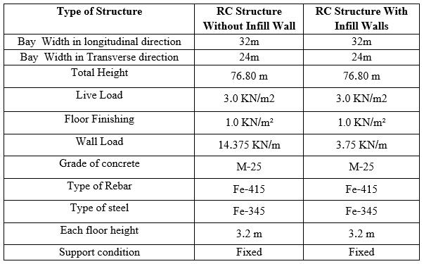 RCbuildingswithandwithoutmasonryinfillwallsarethe typeofbuildings.BuildingPlanConfiguration:Floorheight: 3.2meters,24by32metersofG+23Fourmetersseparates thebaysineachdirection,andtherearesixandeightbaysin total.Property:Theouterandinnercolumnsmeasure600by 700mmandthebeams500by700mm,respectively.The thicknessoftheslabis150mm,andthestrutforthemasonry infill walls measures 390 by 230 mm. Seismic Analysis Techniques: Response Spectrum Analysis Building shape: rectangular;numberofmodels:four(twowithandwithout