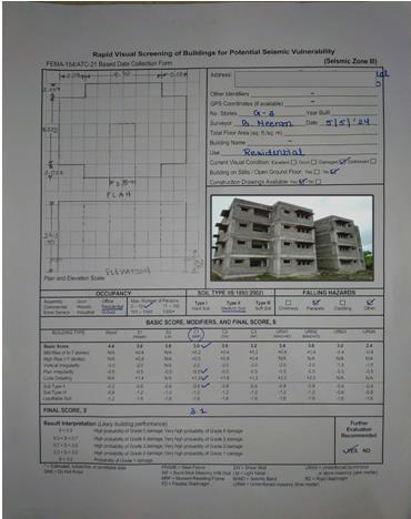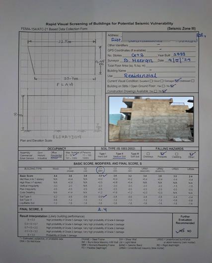 Acompletevisualevaluationwasperformedonabout4–5 G+3 (ground floor plus three storeys) RCC (Reinforced Concrete) buildings. The primary objective of the examination was to evaluate these buildings' overall conditionandusefulness.Basedonthemeasurementsand observations recorded in the RVS form, a score was produced.Thisscoreinfluencedsubsequentdecision-making processes and provided a quantifiable assessment of the building'scondition.
