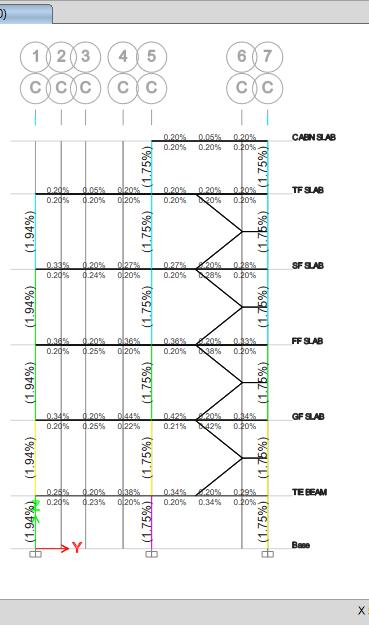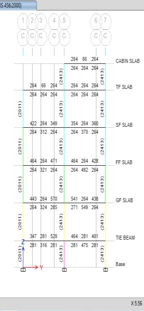 Itseenintheabovementionedpicturethat12to13columns failedthedesigncheckinfirst2storeys. Thedesigncheck reveals an overabundance of O/S capacity ratio mistake, whichmightbecausedbysmallersectionsizes.Manyofthe columns'stresscapacitiesareexceeded,whichrepresentsa