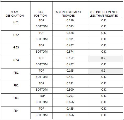 Sofromthischeckitisreportedthattwobeamsthathave improperreinforcingatthetoppositionareGB4andPB1. Theappropriateactionsshouldbetakeninaccordancewith thedesigncriteria,andthesebeamsshouldbeinspectedand alteredinordertomeettheexactreinforcingrequirements. The remaining beams have the required proportions of reinforcement. This deficiency is may be due to the requirementofextracutbarsinthecompressionarea.