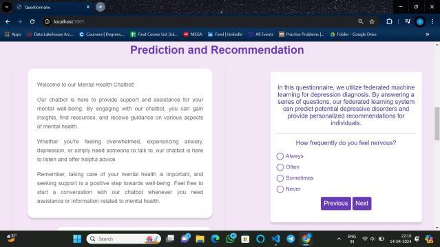 Incorporation of Chatbot Functional- ity: Implemented chatbot functionality to provide immediate support and guidance to users based on theirresponsesanddiagnosisresults.