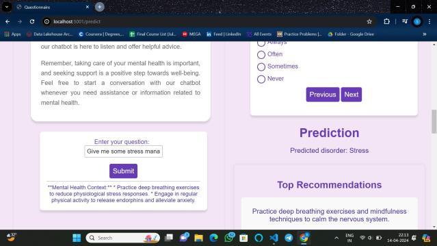 Recommendation Engine Integration: Integrated a recommendation engine basedonpredictionresultsto provide personalized recommendations for mental healthsupportresources.