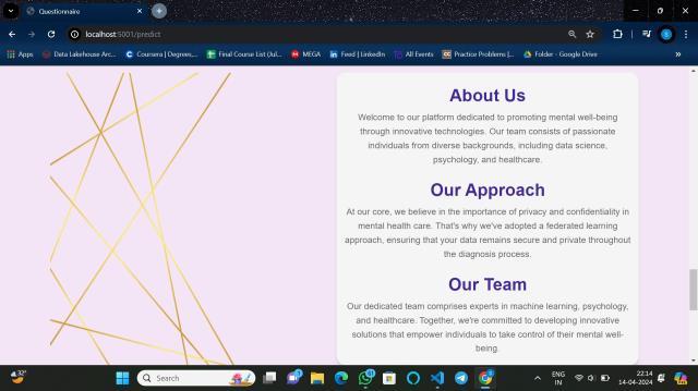 This federated learning approach offers an effective solution for collaborative training on a distributed datasetwhilesafeguardinguserprivacybykeepingraw data on client devices. Through the client-server architecture, secure communication protocols, a separate questionnaire, and the optional chatbot, this method supportsthe developmentofa robust, privacypreserving model for mental health analysis. It also provides users with a potentialsupportsys- tem through the chatbot, enhancing the overall utility and
