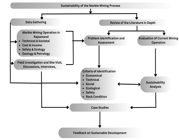 The research methodology is presented in Fig. 1. The marbleareaofRajsamandwasselectedforassessingthe sustainability of ongoing mining operations. InRajnagar (Rajsamand),over50marblequarrieswereinspectedin order to evaluate the viability of existing mining operations. Both the many types of marble found in Rajsamandandthevariedtechniquesusedtominethem were identified. Field visits, site investigations, and group discussions with various stakeholder groups, including lease holders, mining engineers, and supervisors working at various marble quarries in Rajsamand, were used to gather production data, accident records, geological information, meteorological information, lease data, and other information. The sustainability parameters were identified based on the data gathered, and from these the most important parameters for the study were further chosen. These parameters include economic aspects, technical elements,socialfactors,ecologicalfactors,safetyfactors, and rock conditions. On the basis of the data collected, sustainabilityofmarbleoperationwaspursuedfurther.