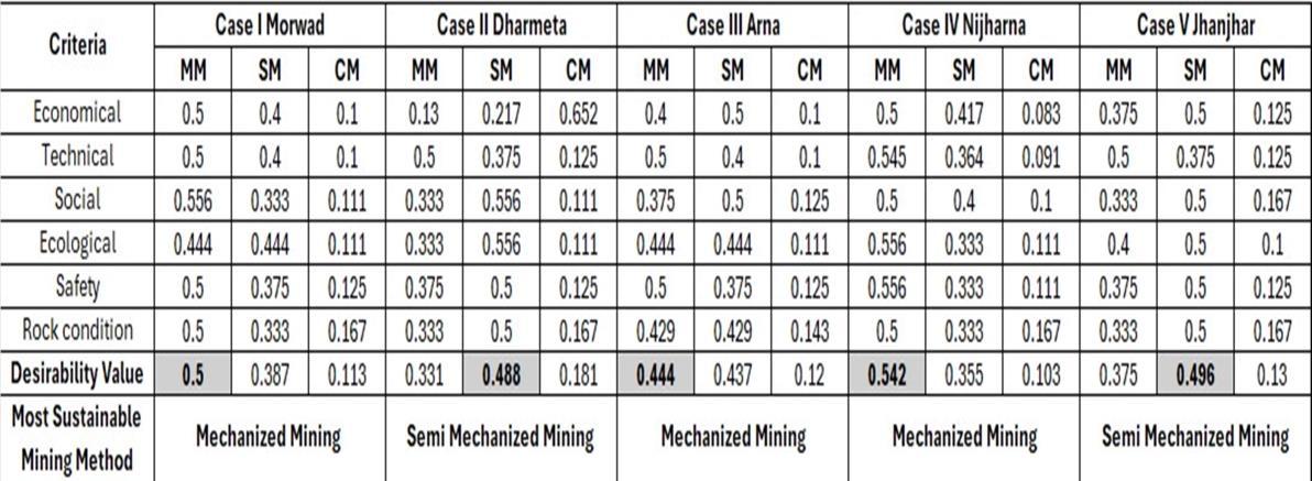 The findings show that mechanised mining has the highest desirability values for the case studies Morwad, Arna, and Nijharna (cases 1, 3, and 4), while semimechanised mining is most desirable for the other case studies Dharmeta and Jhanjhar (cases 2 and 5). This is because both mechanised and semi-mechanised mining methods have a lower environmental effect due to the use of advanced mining equipment such as chainsaws,