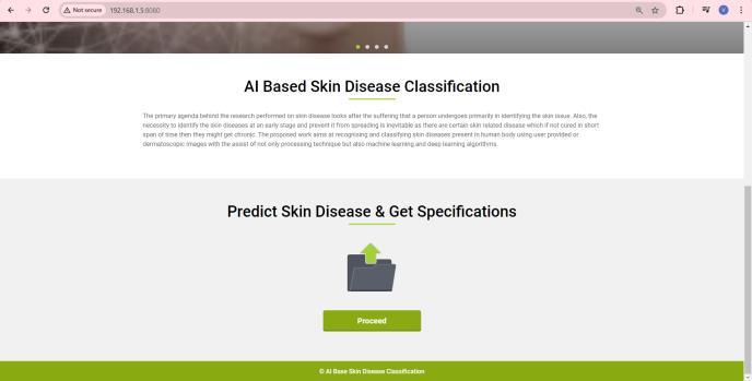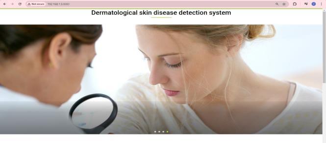 The suggested system's user interface (UI) is made to be simple to use and intuitive, allowing for smooth communication between the user and the Convolutional NeuralNetwork(CNN)model.Themainobjectiveoftheuser interface is to make it simple and effective for users to upload pictures of skin lesions and get diagnostic results. This section describes the UI design, and workflow from pictureuploadtoresultdisplay.