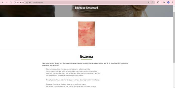 Step 4: This will take you tothe new page which not only contains the name of predicted skin disease on basis of uploadedimagebutalsocertainbasicinformationrelatedto predictedskindiseasealongwithuploadedimage.