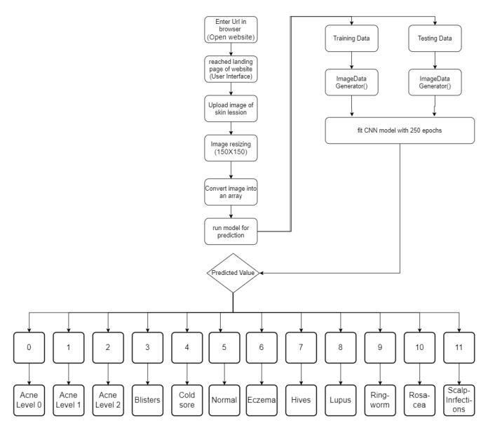 Abstract - Human skin is an unpredictable and almost intricate landscape due to its irregular lesion patterns, moles, varying tone, presence of thick hair, and other confusing features. Identifying the infected skin area and identifying the type of skin disease helps in early awareness. This study deals with the detection system that allows users to detect and identify skin disease by providinganimageoftheaffectedarea as input. In this study, there is one website on which there is a section called upload image inside which user can upload the image of his/her skin lesion, that input image can be taken from the database or by a user. Now, that image goes in backend where image undergoes preprocessing such as resizing and finally the array format of that specific image enter into convolutional neural network, which provides an output between zero to eleven. Each digit is affiliated to specific skin disease for instance Acne_Level_0 is for output digit 0, Acne_Level_1 is for output digit 1. Acne_Level_2 is for output digit 2, Blister is for output digit 3 and so no.