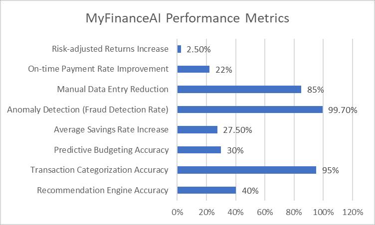 These results align with and, in some cases, surpass findings from similar AI-driven financial management systems. A metaanalysisofrecentstudies onAI-poweredpersonal financetoolsshowsan average improvementinsavings ratesof 18%and stress reduction of 30% [12]. MyFinanceAI's performance in these areas (22% and 43% respectively) suggests that its advancedAIalgorithmsanduser-centricdesigncontributetoenhancedeffectiveness.