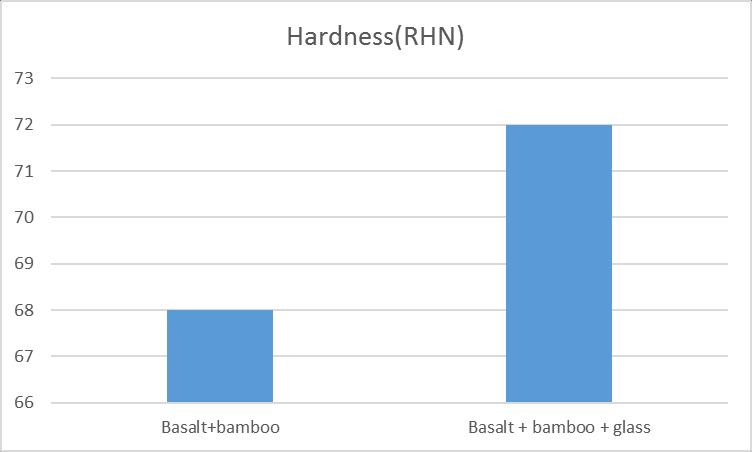 Hardnessisthemechanicalpropertyofthematerialwhich helps it to resist the indentation. Hardness is one of the important parameters in the designing of a material. The process of measuring the hardness is by measuring the depthoftheindentationmarkleftonthematerialwhenload of known pressure is applied on it. Hardness is a typical propertyofamaterial.Hardnessisdefinedastheresistance to indentation, and it is determined by measuring the permanentdepthoftheindentationcausedonthesurfaceof the test material. The least RHN is for the combination of (Basalt+bamboo)i.e.68.AndwhenE-glassfiberispresent alongwiththecombinationof(Basalt+bambooandglass) theRHNis72whichsignifiesthestrengthimpartedbythe glassfibertotheComposite.