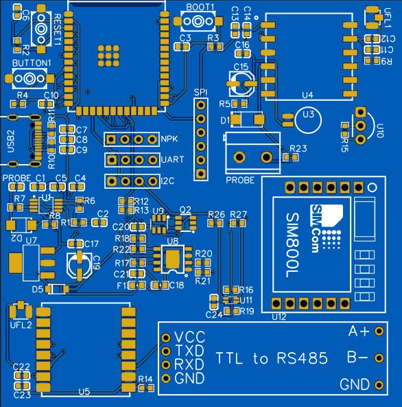 determine the concentration of these nutrients [39]. We used Taidacent RS485 sensor probe for the NPK and pH measurement.TheNPKsensorusesISEsspecifictonitrate (NO3-), phosphate (H2PO4- or HPO42-), and potassium (K+).Thesensorprobes areinsertedintothesoil,andthe electrodes measure the potential generated by nitrate, phosphate, and potassium ions. The sensor's internal microcontroller processes these potentials using the calibrationdatatocalculatetheconcentrationsofN,P,and K levels in the soil. The sensors communicate with the microcontroller using TTL to RS485 converter as sensor outputs in RS485 communication protocol and microcontroller do not accept that protocol. The sensor then sends back a response containing the measurement data.