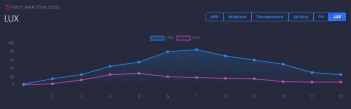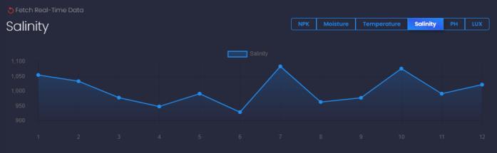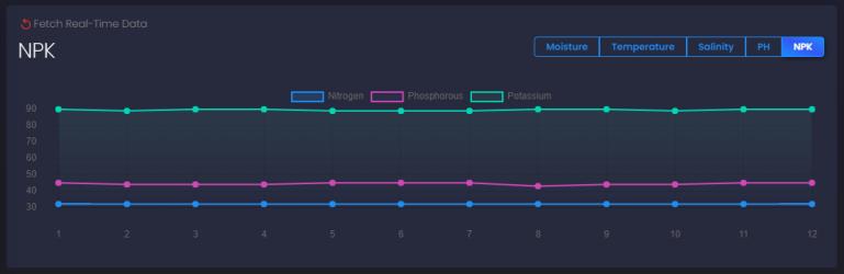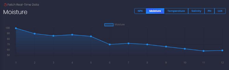 The real time soil data measured by the sensors is transferredusingtheappropriatecommunicationprotocol to the server. The central server stores the data in the storage and at the same time sends the data to the web applicationforvisualization.Theuserinterfaceoftheweb application displays real-time readings of each soil parameter.Thevisualizationwashighlyinterpretableand user-friendlyandcanbeeasilyunderstoodbyanyone.The graphs below show the sensor data generated by our system. The numbers on the x-axis represent the time on twelve different splits or segments taken at an interval of 1 hour starting at 6 a.m., and the y-axis show the corresponding averaged values obtained from the soil sensor.