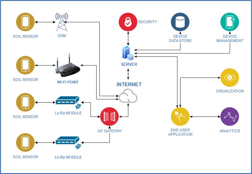 Theoverallsystemblockdiagramwithgeneralworkflowof our system has been depicted in the above figure. The sensor units at different locations in the field can communicate with the centralized server using 3 different