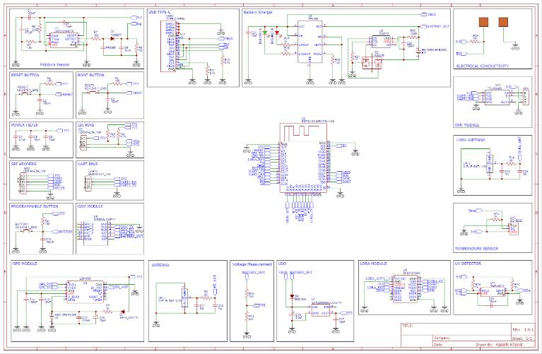 Thecircuitdiagramhasallthecomponentsoftheproposed system with multiple communications and sensing interface.AtthecenterofitistheESP32S3microcontroller withinbuiltWi-Fifunctionality.Thepowermanagementin the system is handled through a USB Type-C connector, along with a battery charging circuit for portable use. The LDOregulatorusedinthesystemprovidesastablevoltage supply to all components with very low quiescent current of 9uA. To ensure reliability of the system, the circuit includes reset and boot with debounce circuits, a programmable user button, I2C, SPI, and UART expansion headers.