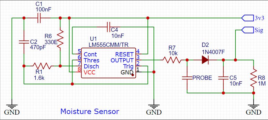 The core of the capacitive moisture sensor is a 555 timer that generates a square wave. The sensor operates based on the change in the soil's dielectric constant with the correspondingchangeinthesoil’smoisturecontent.