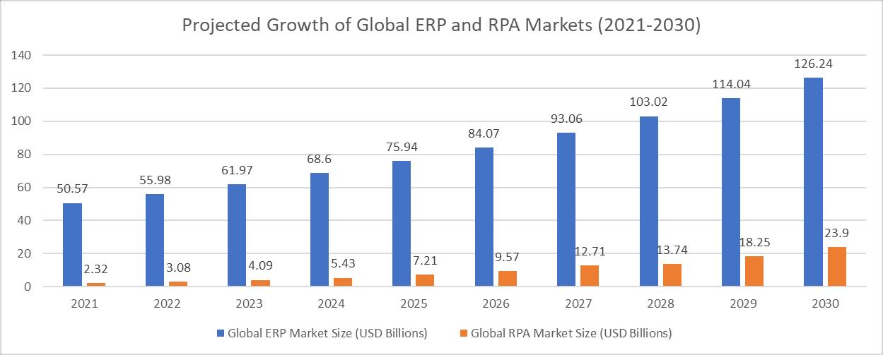 RPAistransformingERPintegrationsbyautomatingrepetitivetasksandstreamliningdataflowbetweensystems.Theglobal RPAmarketsizeisexpectedtoreach$23.9billionby2030,growingataCAGRof27.7%from2021to2030[10].Asignificant portionofthisgrowthisattributedtoERPintegrations.
