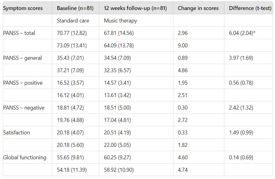 on the PANSS scale. It basically stands for Positive and Negative Syndrome Scale which is specifically used for symptommeasuringinschizophrenicpatients.Theseverity ismeasuredfromrangeof1to7with1beingnonexistent and 7 being extreme.Here, it is basically based on the averagescore,whetherithasgonedown,andifyes,thenby howmuch.Ifyoucomparetheresultsofonlystandardcare versusresultsofstandardcareplusmusictherapy,decrease in numbers can be seen.For example the PANSS-total for standardcarebefore12weeksis70.77andafter12weeksis 67.81.Now,thereisadifferenceof2.96sowecansaythatthe situation improved by that much, which is a really good thing.But,ifwelookatthePANSS-totalformusictherapy,itis 73.09 before the sessions and 64.09 after.There is a differenceofabout9.00whichisaverysignificantchange that has occurred , almost thrice more than in the case of standard care. If we look at the other cases as well music therapyasatreatmentdefinitelyprevailsduetothevisible differenceinthevalues.Therefore,wecansaythisresearch provedtobequiteasuccess.Asaresult,patientswhowerea partofthisprogramwereadvisedtocontinuethispractice.