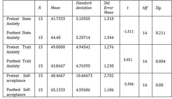 Asseeninthetableabove,beforeandafterchangescanbe seen . While the changes are quite noticeable for some criterias, others are not that affected by it. For example, thereisalittledifferencebetweenthepretestandposttest stateanxiety,butthereisnoticeabledifferencebetweentrait anxiety. Also, pretest and postest positive relations with others and self acceptance criteria shows the most significantdifference.Rightfrom57.933themeanincreased toaround70.6andfrom48.466to65.133respectively.Thus ,we can conclude that music therapy indeed helps in betteringtheconditionofamentalhealthpatient.