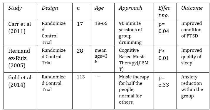 Following information is about how music therapy has helped better the condition of people with anxiety, depression, PTSD and schizophrenia. It is from different researchpapersthatcarriedouttheseexperiments.