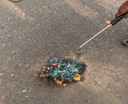Use a blowtorch to melt the HDPE material; the temperature must not exceed 180°C as shown in Fig.5, making sure the material has melted all the way to the bottomofthemould.Permitittocoolfor15to20minutes. After cooling, the HDPE plate should be carefully removed from the mould as shown in Fig.6. Depending on the type and size of the pothole, HDPE plates can be molded into a varietyofshapesandsizes.