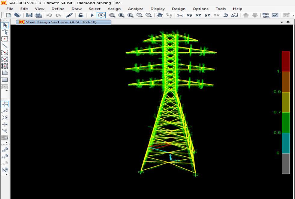 Transmission towers are modelled using various bracing patterns. Axial forces, deflections, and the tower's weight vary depending on the bracing pattern. Specific bracing patterns can help reduce the tower's weight. The main components of a transmissionlineincludeconductors, ground wires, insulation,towers,and foundations.Most ofthetime,transmissionlines aredesignedtowithstandwindandiceloadsinthetransversedirection.