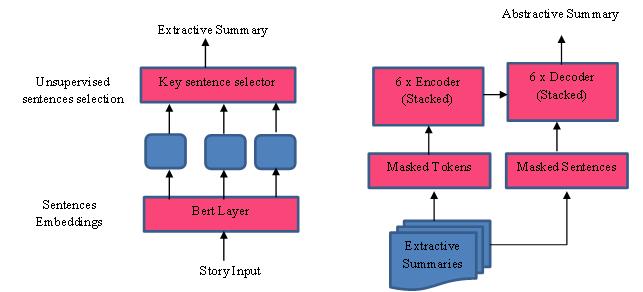 information. Sentence embedding: This technique maps a sentence of words to high-dimensional vectors. This facilitates thesystem'simprovedunderstandingofhowsentencesarerelatedorconnected.Themostcriticalpartoftheseextractive summarizersistheBertlayer.Itisawordrecognizertrainedusingthecontextandsemanticsofwordsineachsentence. The activation uses self-attention, enabling it to pay special attention to specific words and recognize the significance of those words in that sentence. For this task, the story input is again the original text that needs to be summarized (in extractiveSummarization).Thatparagraphmightbecomeasectioninanextendedarticleormultiplearticlesonthesame subject. The purpose is to write a summary that gives justice and encapsulates the essence of the story input. This is ridiculous becausethesystemcanevenapplymaskedtokensandsentencestorounddownitssetofessentialsentences. Maskedtokens:-referringtowordsorphraseswhosecontentshavebeenmaskedandreplacedwithplaceholdersymbols during training so that the model can fill in the blanks & give a proper context for the text. On the other hand, masked sentencesarewhenwemaskawholesentenceandletthemodelgenerateanewsentencesummarisingasignificantpart of this masked sentence. The system then combines these key sentences to produce an extractive summary. These encoders join forces to produce an improved and thorough summary. Unlike extractive Summarization, abstractive Summarization includes using NLP techniques to create summaries instead of extracting and reconstructing sentences. This approach is more challenging but can produce more natural summaries with a similar structure, such as humanwritten summaries. The extractive summarization operations generally select and combine sentences from the original textusingadvancedlanguageprocessingtechniquessuchassentence embedding,Bertlayersor self-attention. Together, thesemethodsmayprovidegoodsummariesthatwillcapturemostofthemeaningfulcontentinthetext.