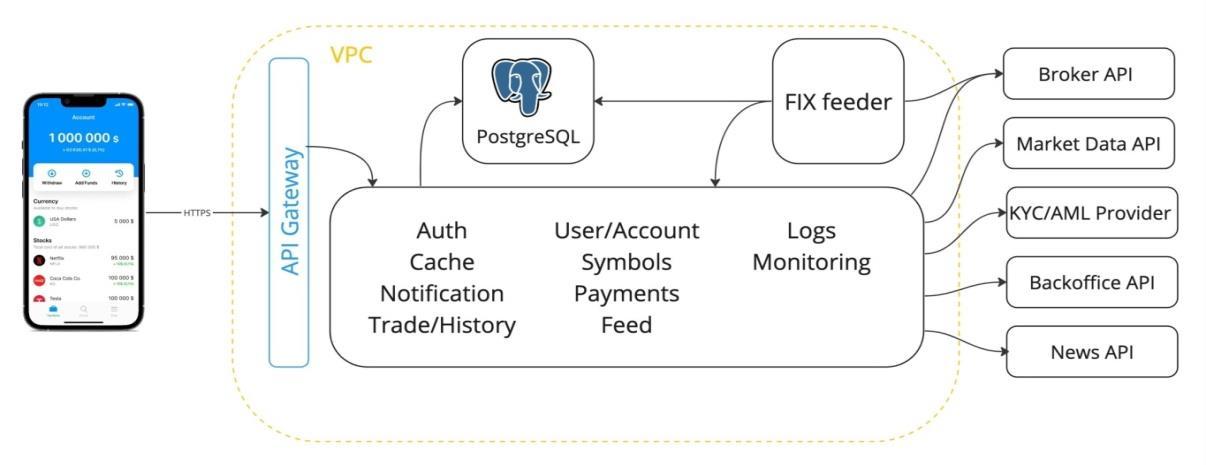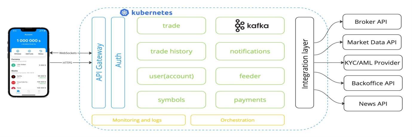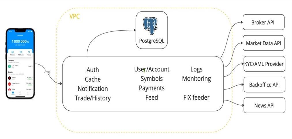 Authentication and authorization, caching, and notification services are some of the components that the financial services platform offers to banks and fintech companies in order to assist them in expanding their user base and capitalization, trade history, user account management, symbol management, payment gateway, data feed, log monitoring, FIX feeder, broker API, market API, KYC/AML service, back-office API, and newsfeed.Theplatformwasinitiallyconstructedusinga monolithic architecture that included the Java Spring Framework and PostgreSQL, as depicted in Fig. 1. Because of the high load on the FIX protocol, it faced performanceandscalabilityissues.Toaddressthese,the platform transitioned to a microservices architecture withasynchronoustaskprocessingviaKafka,leveraging HTTPS and web sockets for stability. This transition