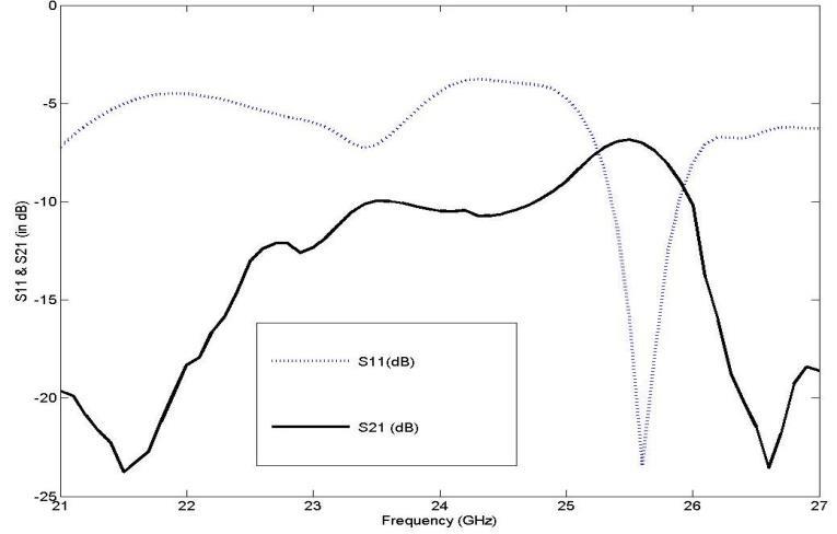 Figure 6 shows the simulated S11(dB) & S21(in dB) for thefinalfilterdesigned.ThisresultshowsS11hascentre frequency of 25.6 GHz &-23.45dB. while the minimum S21 has the minimum S21 has values of -23.57dB. From thefigureitisclearlyshownthattheS21hascompletely pass the S11 band So this shows that the proposed designed is be haves like a band pass filters having centrefrequencyof25.6GHz.