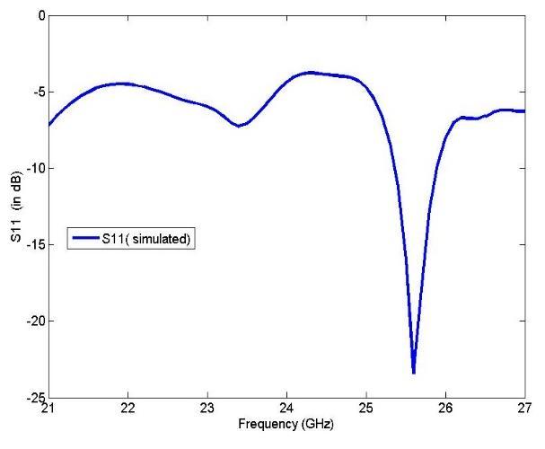 After getting the propose filtering results the structure hasbeenmodifiedtofilteringantennaasshownfigure2. The figure 7 shows the S11 result of filtering antenna having resonant frequency of 25.6 GHz. The filtering antenna works in band range of 25.6 GHz to 25.9 GHz withapproximate500MHzbandwidth.